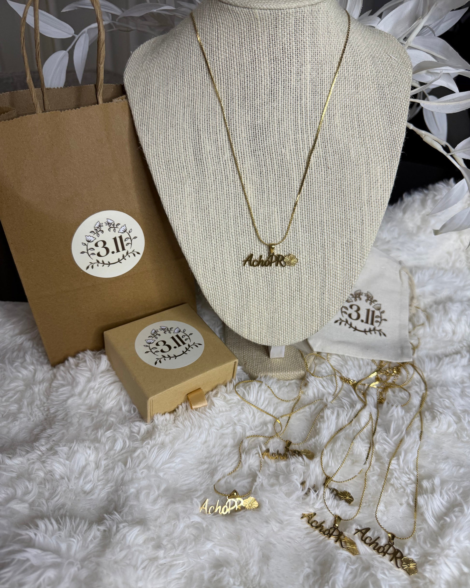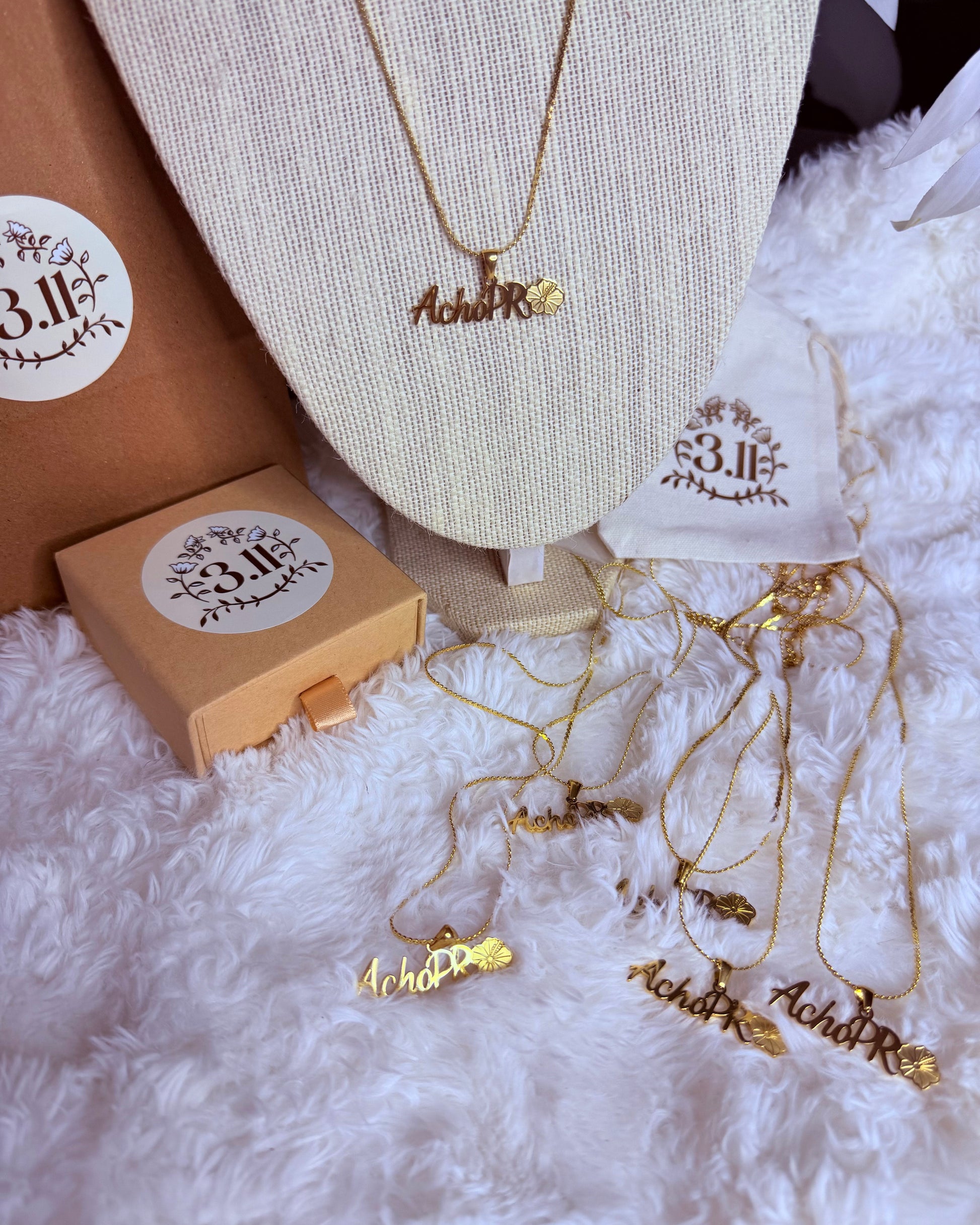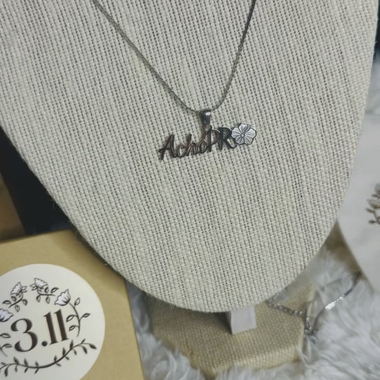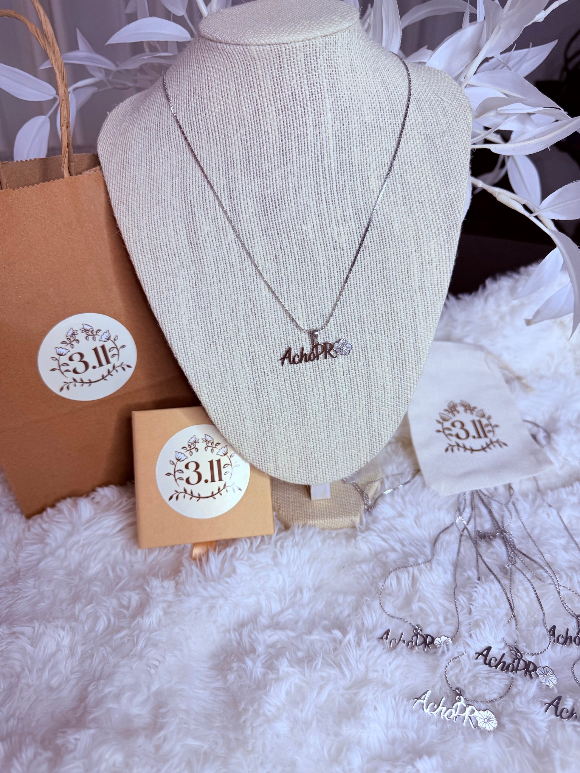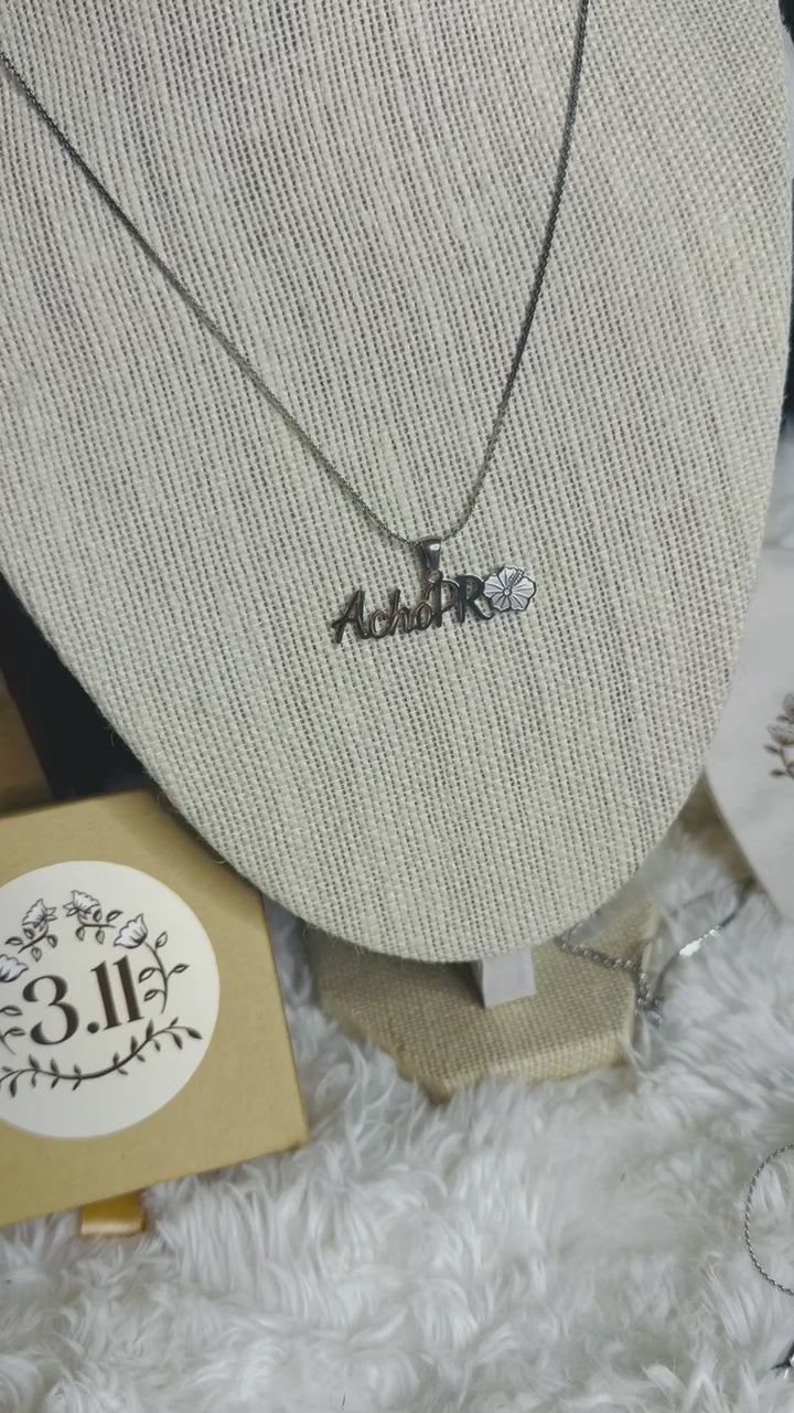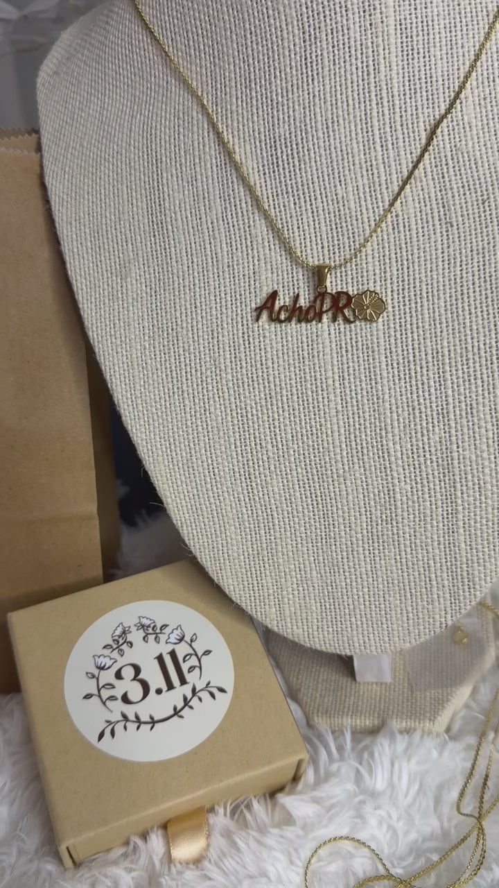 Stainless steel necklace engraved with “ACHO PR” and a poppy, a symbol of strength, pride, and Puerto Rican roots. A piece that blooms with identity and character.